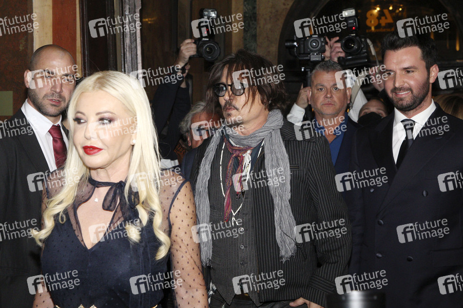Monika Bacardi, Johnny Depp und Andrea Iervolino beim Galaevent zu Ehren Johnny Depps und zur Vorstellung der Zeichentrickserie 'Puffins' im Studio 1905. Belgrad, 19.10.2021