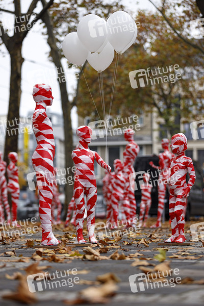 Kunst-Installation 'It is like it is - Mahnmal zur Coronakrise - 2020', einer Installation aus 111 maskierten Schaufensterpuppen, von Dennis Josef Meseg anlässlich der strengen Maßnahmen der Bundesregierung wegen der Coronakrise auf dem Neumarkt. Köln, 11.11.2020