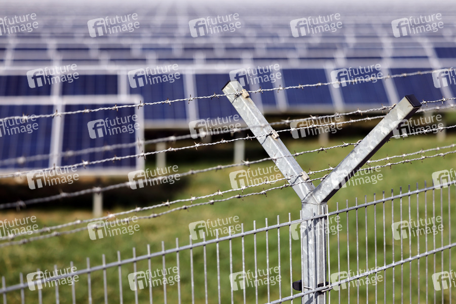 Der Solarpark Troisdorf Oberlar ist eine Fotovoltaik-Solarstromanlage der Stadtwerke Troisdorf und das größte Solar-Kraftwerk in NRW. Die Freilandanlage kann etwa 1000 Haushalte in der Region mit sauberem Solarstrom versorgen. Ein Stacheldrahtzaun umgibt das Gelände. Troisdorf, 12.02.2022