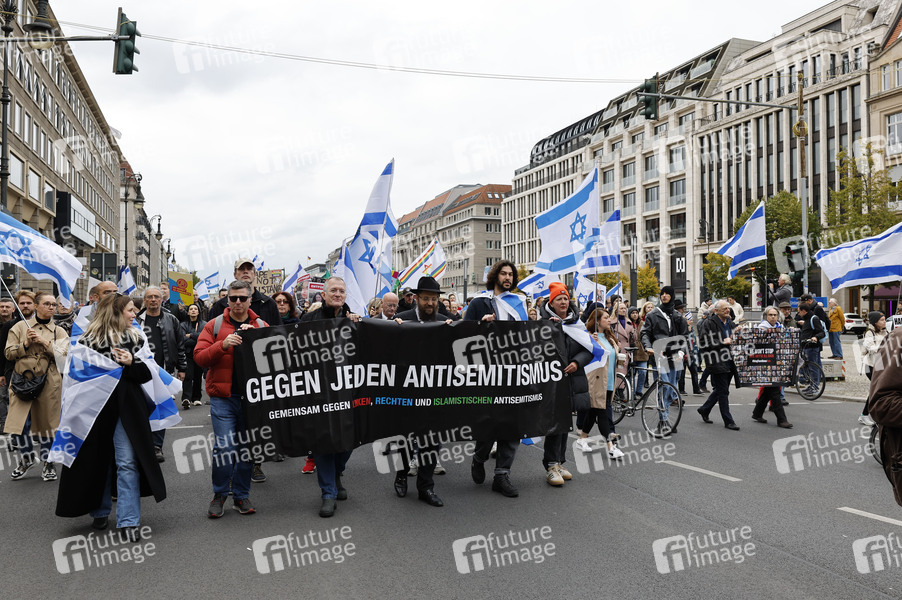 Teilnehmer der Demonstration zum Jahrestag des Hamas-Massakers in Israel unter dem Motto 'Gemeinsam gegen das Verbrechen der Hamas an Israelis und Palästinensern. Für die Freilassung der Geiseln und das Ende der Hamas-Herrschaft in Gaza.' vom Brandenburger Tor zum Bebelplatz. Berlin, 06.10.2024
