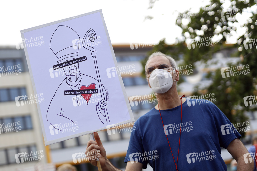 Bei einer Kundgebung auf dem Börsenplatz kritisieren Gläubige aus dem Erzbistum Köln und Aktivisten der Bewegung Maria 2.0 das Verhalten der Kirche und Erzbischof Rainer Maria Kardinal Woelki bei der Aufarbeitung des Missbrauchskandal. Am Nachmittag trifft auch eine Pilgergruppe von Pfarrer Klaus Koltermann aus Dormagen Nievenheim mit 60 Christen nach 40 Km Fußmarsch unter dme Motto 'Aufbruch nach Köln' auf dem Börsenplatz ein. Koltermann hat sich als einziger Pfarrer in Deutschland für den Rücktritt von Kardinal Woelki ausgesprochen. Köln, 12.06.2021