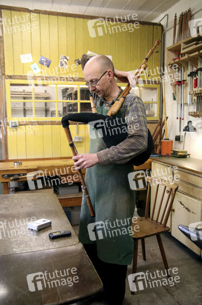 Aussterbende Zunft, Werkstatt, Instrumentenbau, Dudelsack, Sackpfeife, Holzblasinstrument, Sessionprotz, Schäferpfeife, Spielpfeife, Säckpipa, Säckpipor, Dudelsackmanufaktur, Handwerk, Werkzeuge, Werkzeuge, Herstellung, Hersteller, Innung, Zunft, Zünfte, Handwerkskunst, Handarbeit, Musik, Musikinstrument, Pfeife, Pfeifen, Kunsthandwerk, Symbolfoto, Symbolbild