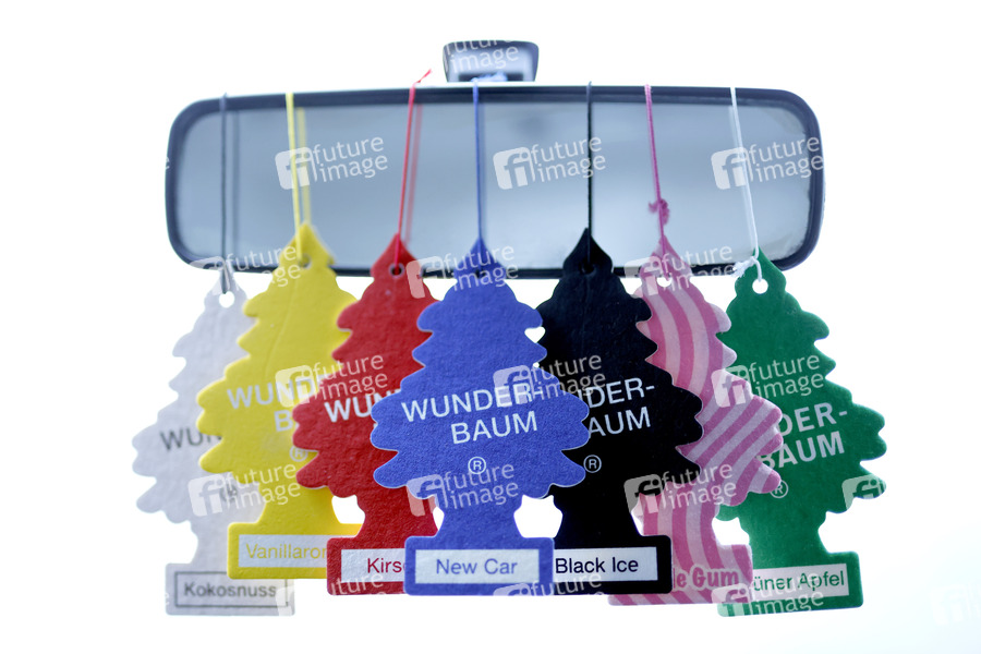 Wunderbaum, Wunderbäume, Wunder-Baum, Wunder-Bäume, Auto-Duft, Auto-Luft, Auto-Lufterfrischer, Dufterfrischer, Lufterfrischer, Geruch, Geruchsneutralisierung, Duft, Autozubehör, Auto-Zubehör, Rückspiegel, Fahrzeuginnenraum, Duftspender, New Car, Black Ice, Bubble Gum, Grüner Apfel, Kokosnuss, Kirsche, Vanillearoma, Aroma, Augenreizung, Car-Freshner, Duftstoffe, Duftbaum, Duftbäumchen, Reizüberflutung, Riechen, Teil der Populärkultur, Symbolbild, Symbolfoto