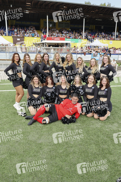 Tim Mälzer und die HSV Cheerleader beim Benefiz-Fußballspiel 'Kicken mit Herz' 2024 zu Gunsten des Herzzentrums des UKE im Stadion des SC Victoria. Hamburg, 08.09.2024