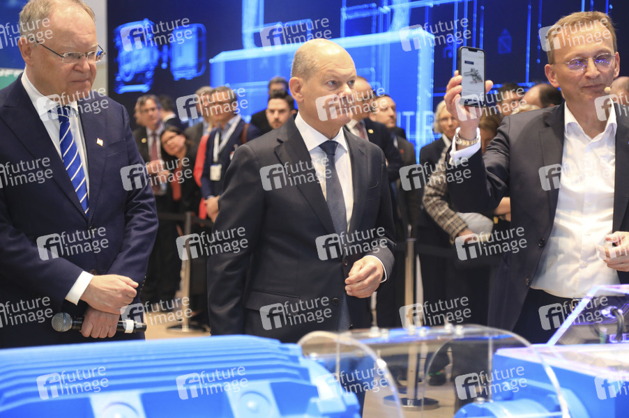 Stephan Weil, Olaf Scholz und Andreas Evertz am Stand der Firma Flender beim Eröffnungsrundgang auf der Hannover Messe 2025 auf dem Messegelände. Hannover, 31.03.2025