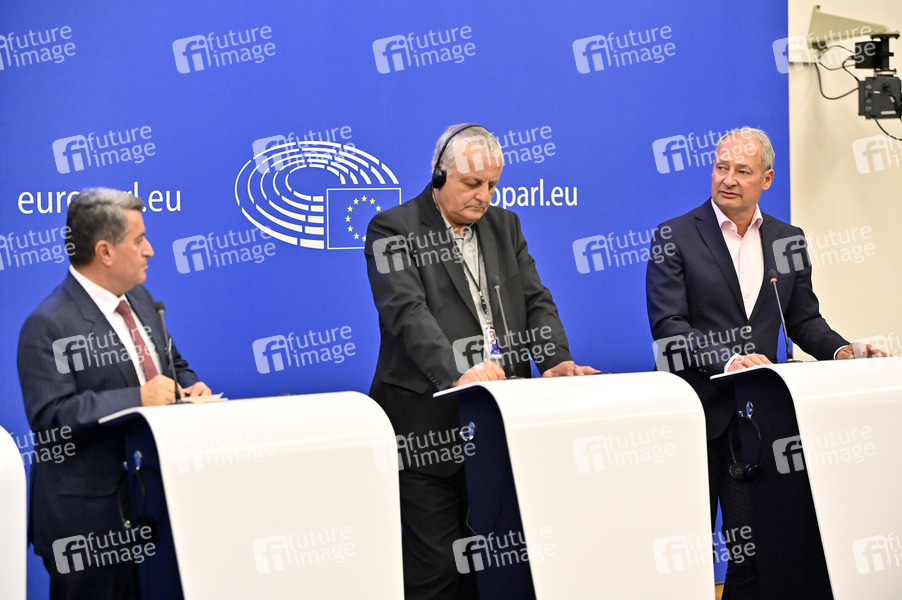 Abdulkarim Omar, Francois Alfonsi und Andreas Schieder bei einer Pressekonferenz zur Bedrohung durch ISIS in Nord- und Ostsyrien, die Situation von ISIS-Familien im Lager Al-Hol und die Verantwortung Europas im Europäischen Parlament. Straßburg, 13.09.2022