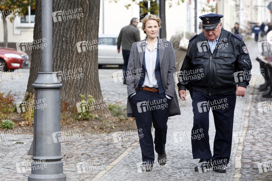 Maria Simon und Horst Krause beim Fototermin am Set des ARD-Krimis 'Polizeiruf 110 - Käfer und Prinzessin' (AT) am Rathaus Beelitz. Beelitz, 01.11.2013