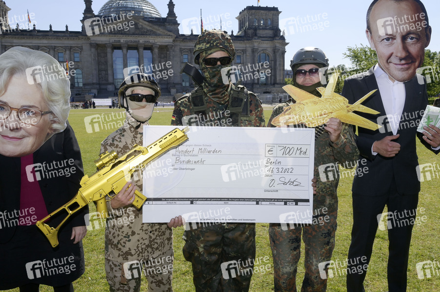 Aktivisten bei einer Protestaktion gegen das sogenannte Sondervermögen von 100 Milliarden für die Bundeswehr vor dem Reichstagsgebäude. Berlin, 03.06.2022