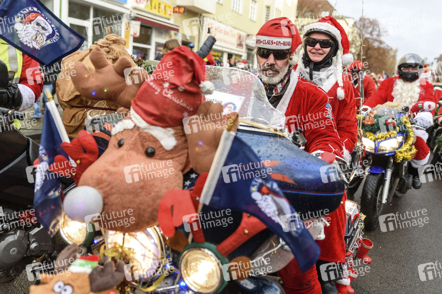 Motorradfahrer in Weihnachtsmann-Kostümen nehmen an der jährlich Weihnachts-Motorradtour ab Berlin-Steglitz teil. Über das gesamte Jahr wurden Spenden gesammelt, die nun von dem Motorrad-Weihnachtsmännern an verschiedene soziale Einrichtungen in Berlin verteilt werden. Berlin, 14.12.2019