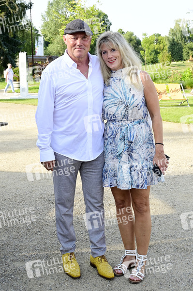 Matthias Atze Döschner mit Ehefrau Dorit Döschner bei der Premiere des Theaterstücks 'Maxe Baumann - Ferien ohne Ende' während der Beelitzer Festspiele 2025 auf der Freilichtbühne. Beelitz, 14.08.2025