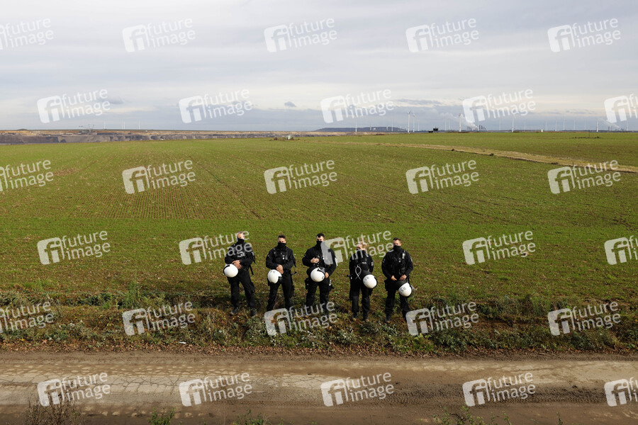 Kohlegegner wie Mitglieder von Greenpeace, Fridays for Future und linksradikalen Gruppen wie der Antifa haben in Lützerath gegen den Tagebau protestiert. Das kleine Dorf an der Kante von Garzweiler soll dem Braunkohleabbau weichen. Allerdings will der Energiekonzern RWE vorerst auf den Abriss verzichten. Im Bild Polizisten verloren auf einem Feld bei der Demo gegen den Abriss. Lützerath, 31.10.2021