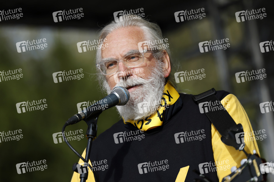 Kohlegegner wie Mitglieder von Greenpeace, Fridays for Future und linksradikalen Gruppen wie der Antifa haben in Lützerath gegen den Tagebau protestiert. Das kleine Dorf an der Kante von Garzweiler soll dem Braunkohleabbau weichen. Allerdings will der Energiekonzern RWE vorerst auf den Abriss verzichten. Im Bild Liedermacher Gerd Schinkel. Lützerath, 31.10.2021