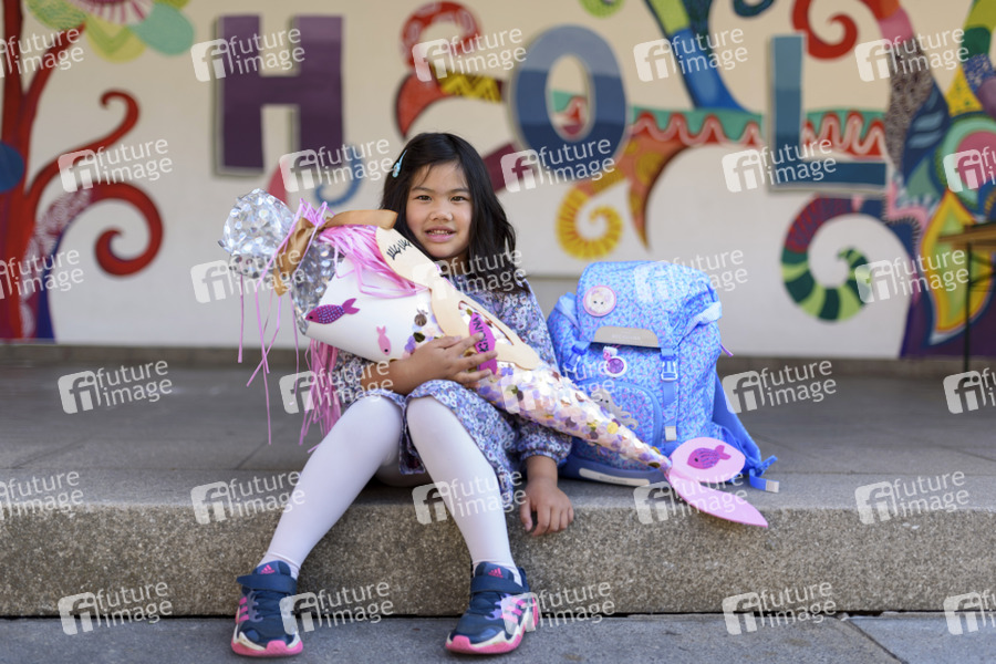 Ein junges Mädchen bekommt zum ersten Schultag bzw. zu ihrer Einschulung in die Grundschule eine Schultüte. (Model Release, Themenbild, Symbolbild) Nürnberg, 15.09.2021