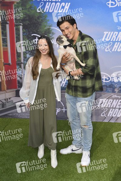 Veronica Merrell, Aaron Burriss mit Hund Guppy the Pug bei der Premiere der Disney+ TV-Serie 'Turner & Hooch' im Westfield Century CityMall Atrium. Los Angeles, 15.05.2021