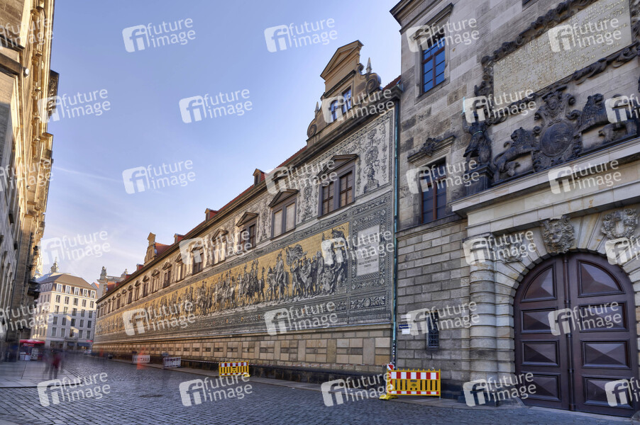 Der Fürstenzug in Dresden ist ein überlebensgroßes Bild eines Reiterzuges, aufgetragen auf rund 23.000 Fliesen aus Meißner Porzellan. Das 102 Meter lange, als größtes Porzellanwandbild der Welt geltende Kunstwerk stellt die Ahnengalerie der zwischen 1127 und 1873 in Sachsen herrschenden 34 Markgrafen, Herzöge, Kurfürsten und Könige aus dem Geschlecht des Fürstenhauses Wettin dar. Dresden, 30.11.2021