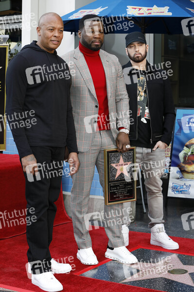 Dr. Dre, Curtis '50 Cent' Jackson und Eminem bei der Zeremonie zur Verleihung von einem Stern an Curtis '50 Cent' Jackson auf dem Hollywood Walk of Fame. Los Angeles, 30.11.2020