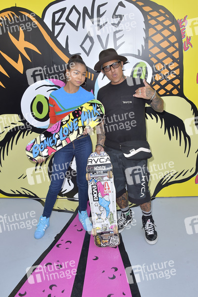Navia Robinson und Christian Hosoi beim Start der Pop-up-Skatepark-Initiative 'Bones Love Milk' des California Milk Processor Board. Huntington Beach, 24.07.2019
