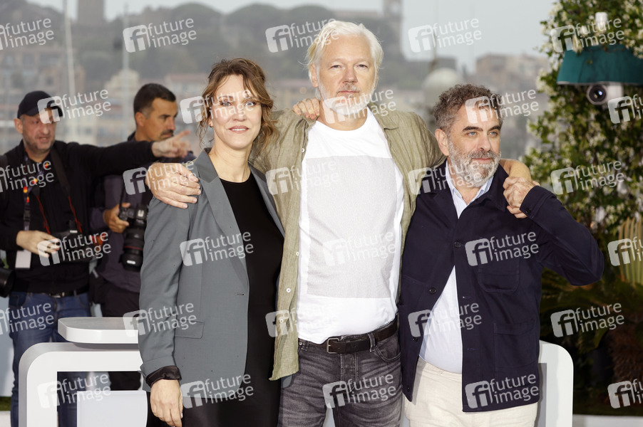 Eugene Jarecki, Julian Assange und Kathleen Fournier beim Photocall zum Dokumentarfilm 'The Six Billion Dollar Man' auf dem Festival de Cannes 2025 / 78. Internationale Filmfestspiele von Cannes am Palais des Festivals. Cannes, 20.05.2025