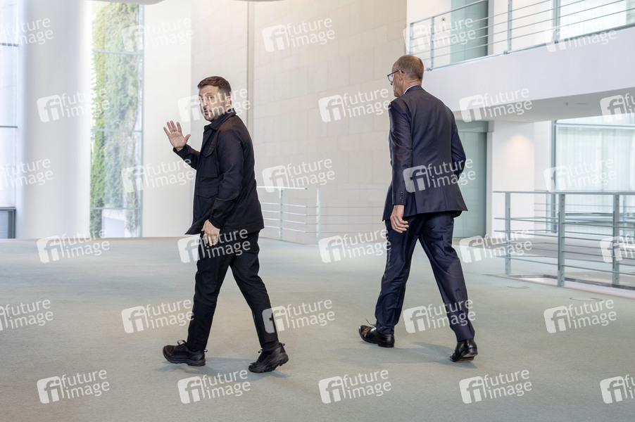 Wolodymyr Selenskyj und Friedrich Merz beim Pressestatement zum virtuellen Treffen zur Ukraine im Bundeskanzleramt. Berlin, 13.08.2025