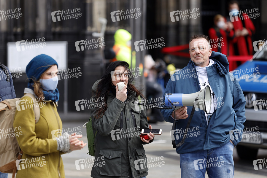 Eine unangemeldete Demo von Kritikern der Corona-Maßnahmen vor dem Kölner Dom wurde durch die Polizei aufgelöst. Die Demonstranten hatten sich ohne Masken und Mindestabstand versammelt und Parolen wie 'Widerstand! Widerstand!' skandiert. Die Teilnehmer protestieren gegen die aus ihrer Sicht überzogenen Corona-Maßnahmen und fürchten die Etablierung einer Corona-Diktatur. Köln, 27.03.2021