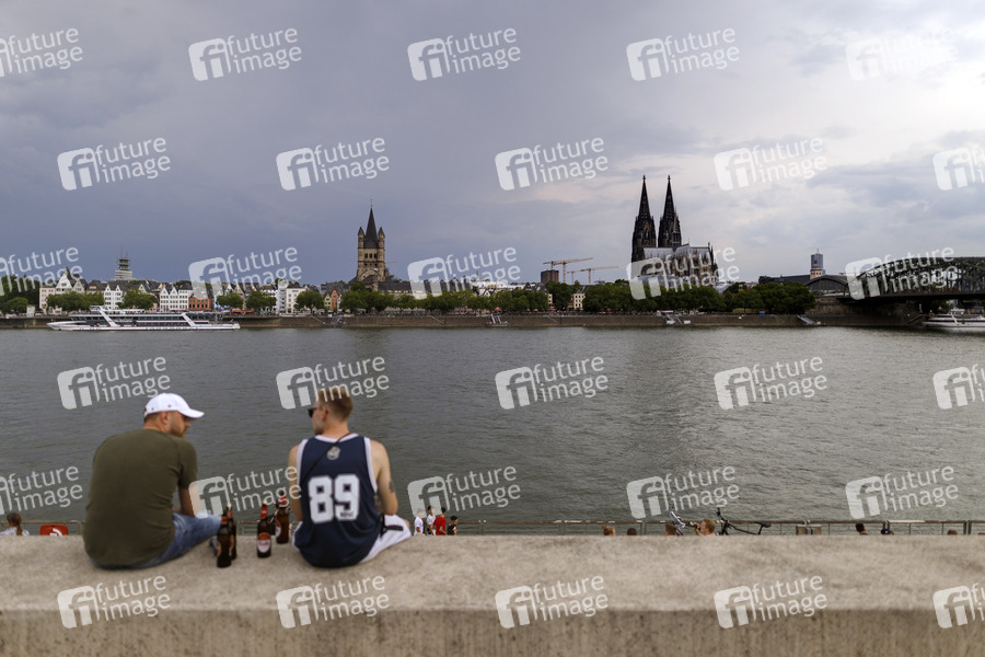 Nach der Lockerung der Corona-Maßnahmen wie des Kontaktverbot sitzen Passanten wieder am Rheinboulevard und genießen Kölsch. Köln, 26.06.2020