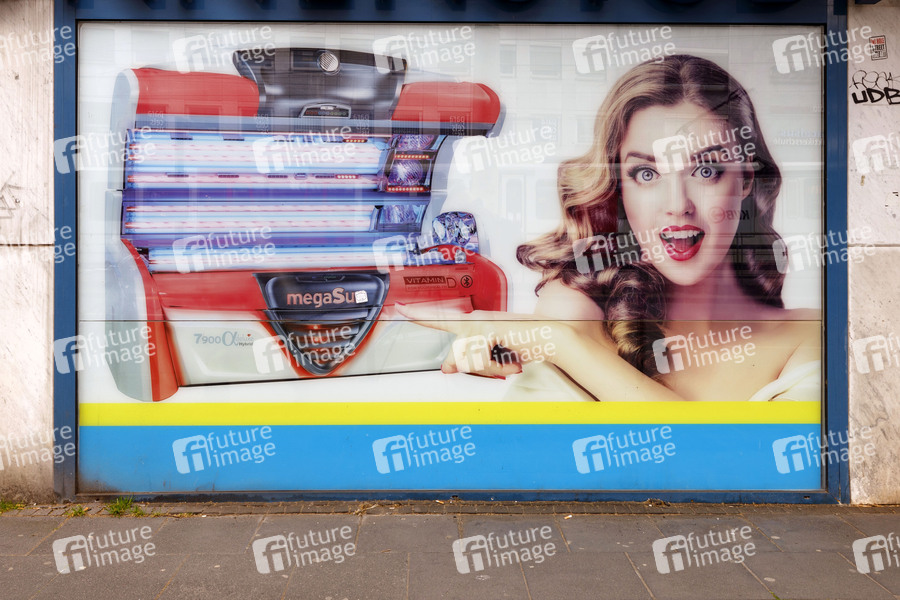 Eine von der Sonne ausgebleichte Werbung für eine neue Sonnenbank an einem Sonnenstudio. Sonnenstudios sind von den Corona-Regeln betroffen und müssen bei Inzidenz über 100 wieder schließen. (Themenbild, Symbolbild) Köln, 29.04.2021