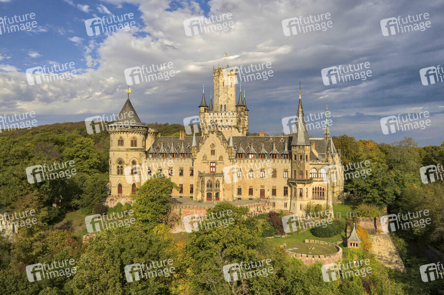 Luftbild vom Schloss Marienburg im Herbst auf dem Marienberg (Freigabe zur Veröffentlichung für Presse-und Öffentlichkeitsarbeit ist von Frau Annette Langhorst als Pressevertretung des Schloss Marienburg/EAC GmbH erteilt worden). Nordstemmen, 13.10.2019