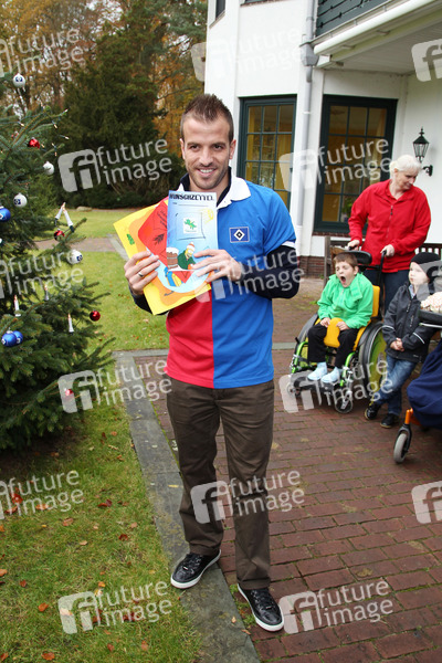 HSV-Spieler Rafael van der Vaart und HSV-Maskottchen Hermann schmücken einen Weihnachtsbaum im Kinder-Hospiz Sternenbrücke, Hamburg