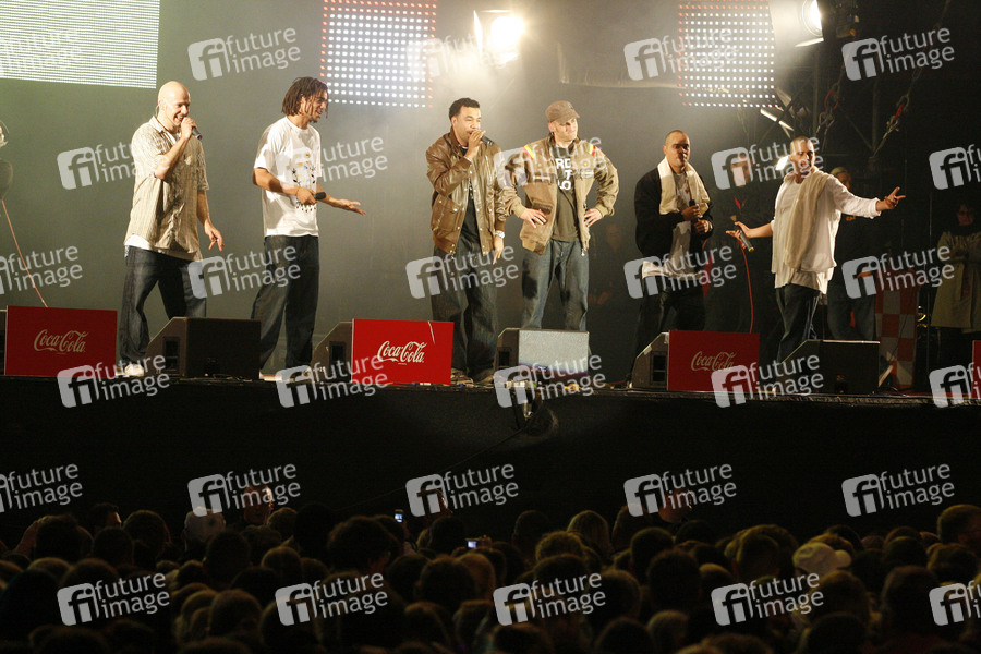 Culcha Candela live beim Coca Cola 'Soundwave 2007' vor dem Brandenburger Tor in Berlin. Die Sänger Jonny Strange (Uganda), Larsito (Kolumbien), Itchyban (Polen), Lafrotino (Kolumbien), Mr. Reedoo (Deutschland), Don Cali (Kolumbien) und DJ Chino con Estilo (Republik Korea)