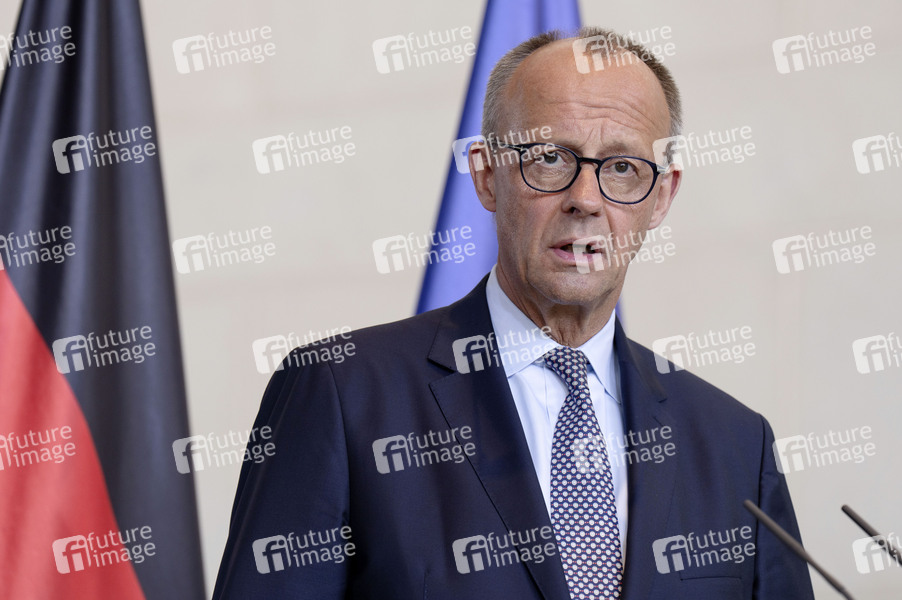 Friedrich Merz beim Pressestatement zum virtuellen Treffen zur Ukraine im Bundeskanzleramt. Berlin, 13.08.2025