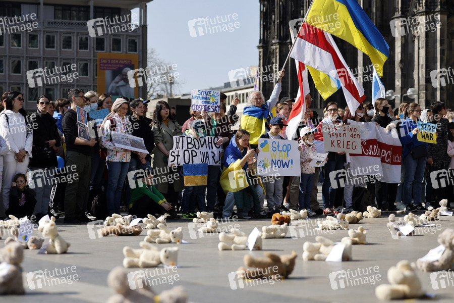 Der deutsch ukrainische Verein Blau Gelbes Kreuz e.V. legt bei einer Kundgebung unter dem Titel 'Frieden für Europa! Schützt die Kinder der Ukraine' Teddybären auf dem Roncalliplatz vor dem Kölner Dom für in der Ukraine getötete Kinder nieder. Nach Mitteilung der ukrainischen Behörden sind seit dem 24.2.2022 über 135 Kinder durch Bomben im Krieg in der Ukraine ums Leben gekommen. Köln, 26.03.2022