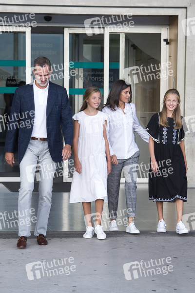 König Felipe VI. von Spanien, Prinzessin Sofia von Spanien, Königin Letizia von Spanien und Prinzessin Leonor von Spanien besuchen Juan Carlos nach seiner Herzoperation im Hospital Universitario Quirónsalud Madrid. Pozuelo de Alarcón, 26.08.2019