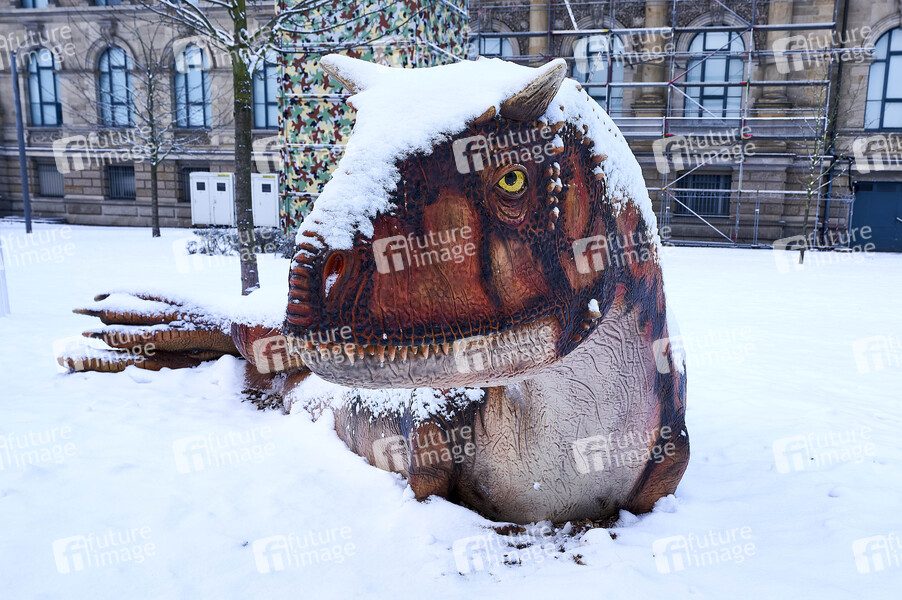 Verschneiter Dinosaurier am Landesmuseum zur Sonderausstellung 'Kinoaaurier. Zwischen Fantasie und Forschung'. Hannover, 30.01.2021