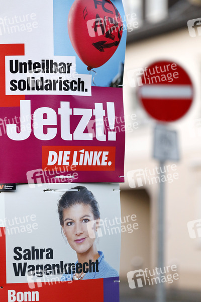 Wahlplakate der Partei Die Linke mit der Aufschrift 'Unteilbar solidarisch. Jetzt! Die Linke.' und dem Konterfei von Sahra Wagenknecht. Laut neuester Umfragen gewinnt die SPD weiter Prozentpunkte hinzu, wodurch ein grün-rot-rotes Bündnis eine Mehrheit im Bundestag hätte. Bonn, 01.09.2021