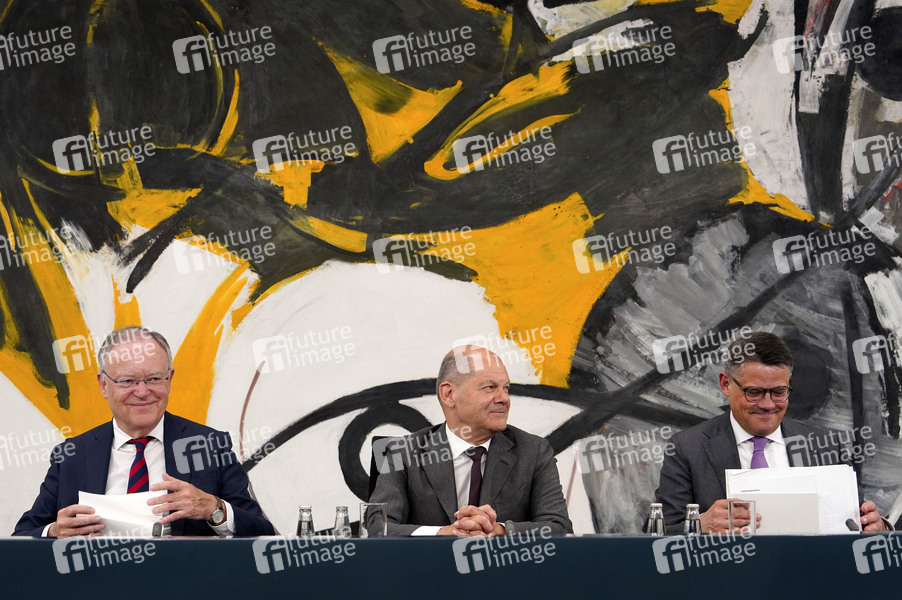 Stephan Weil, Olaf Scholz und Boris Rhein bei der Pressekonferenz im Anschluss an die Beratungen der Bundesregierung mit den Regierungschefinnen und Regierungschefs der Länder im Bundeskanzleramt. Berlin, 20.06.2024