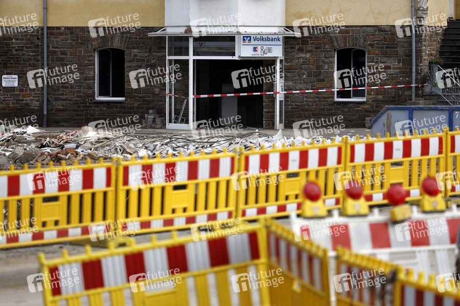 Nach dem Jahrhunderthochwasser in der Eifel durch heftige Regenfälle und Dauerregen mit Überschwemmungen und Überflutungen haben die Aufräumarbeiten im Ahrtal große Fortschritte gemacht. Einheiten von Polizei, THW, Bundeswehr und Feuerwehr mitsamt vielen freiwilligen Helfern haben Straßen geräumt, Schutt und Schlamm entfernt und die Menschen versorgt. Der Wiederaufbau wird trotzdem Jahre dauern. Im Bild Flutschäden in der Ortschaft Altenahr, in der die Flut viele Häuser zerstörte, 08.08.2021