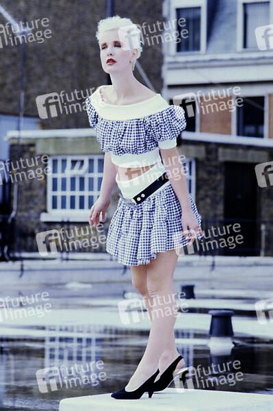 Paula Yates bei einer Modepräsentation auf einem Dach. London, 15.09.1987