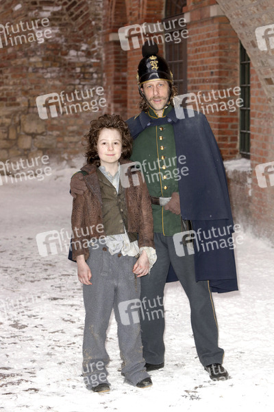 Maximilian Ehrenreich und Oliver Korittke beim Fototermin am Set des Fernsehfilms 'Das Mädchen mit den Schwefelhölzern' aus der ARD-Märchenreihe 'Sechs auf einen Streich' in der Zitadelle Spandau. Berlin, 18.03.2013