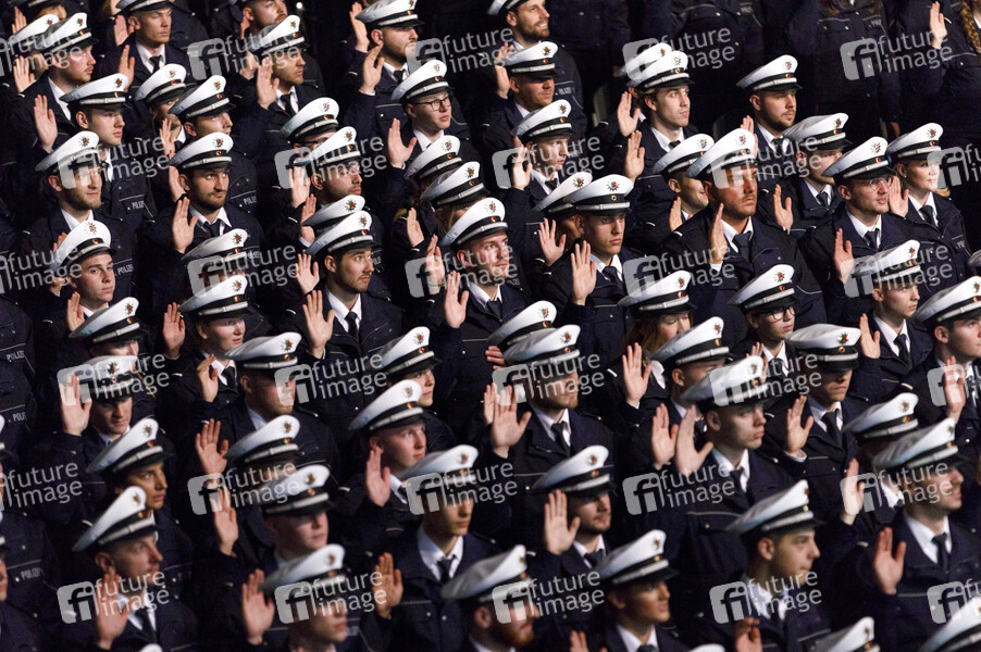 Vereidigung von neuen Kommissaranwärterinnen und Kommissaranwärtern samt traditionellem Mützenwurf in der Lanxess-Arena. Köln, 03.04.2019