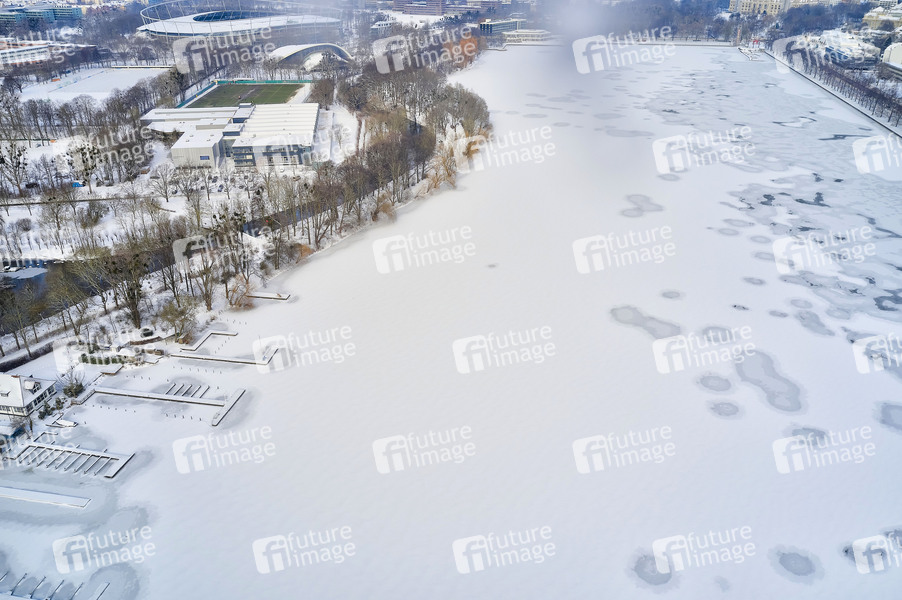 Luftbild vom zugefrorenen Maschsee und der Südstadt im Winter. (Der Drohnenflug wurde ordnungsgemäß bei der Polizei Leitstelle Hannover angemeldet) Hannover, 09.02.2021