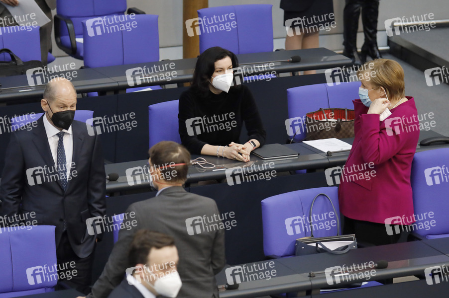 Olaf Scholz, Karl Lauterbach, Dorothee Bär und Angela Merkel in der 218. Sitzung des Deutschen Bundestages im Reichstagsgebäude. Berlin, 25.03.2021
