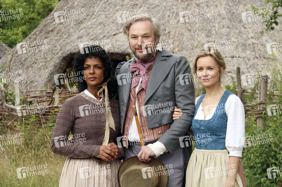 Dennenesch Zoude, Stephan Grossmann und Stefanie Stappenbeck beim Pressefototermin am Set des Märchenfilms 'Das Märchen vom goldenen Taler' für die ARD-Märchenreihe 'Sechs auf einen Streich' im Museumsdorf Düppel. Berlin, 08.07.2020