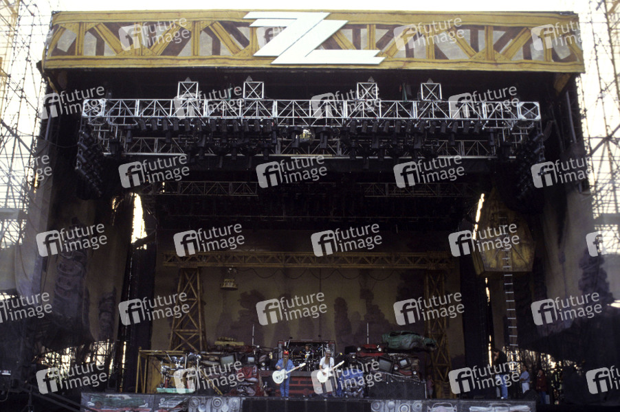 Dusty Hill, Frank Beard und Billy Gibbons von ZZ Top beim Soundcheck zum Konzert der 'Recycler World Tour' in der Milton Keynes Bowl. Milton Keynes, 06.07.1991
