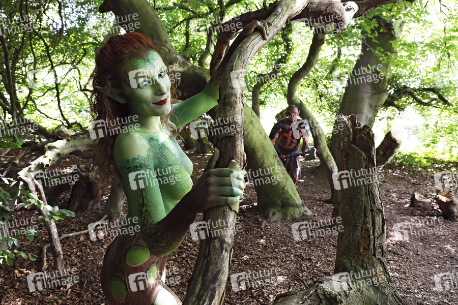 Bodypainting, Body-Painting, Cosplay, Cosplayer nackt, Akt, weiblich, Körperkunst, Körperfarben, Farbe, Bemalung, Kunst, Malerei, Fantasy, Märchen, Wald, Buchen, Buchenwald, Bäume, Natur, Waldfee, Fee, Troll, Fantastic, draußen, body painting, nude, body art, colors, fairy tale, trees, forest, nature, beech, outdoors
