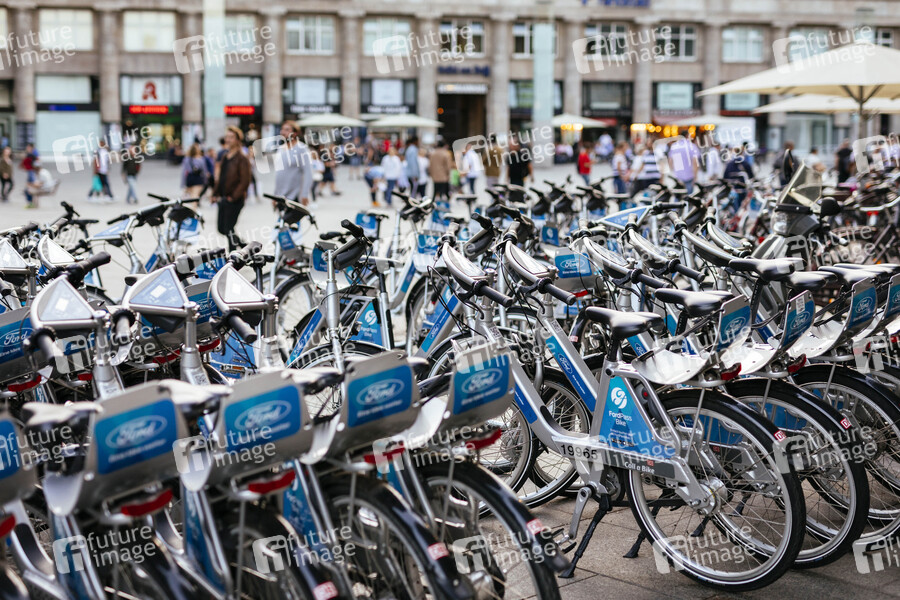 Mietfahrräder von FordPass Bikesharing stehen auf dem Bahnhofsvorplatz. Köln, 03.08.2019