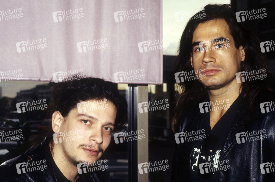 Dave Lombardo von Slayer und Reed St. Mark von Mind Funk Backstage im Hammersmith Odeon. London, 05.11.1991