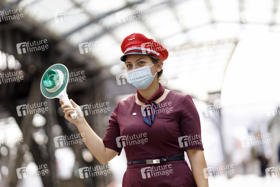 Ordnungsämter, Bundespolizei, die Bahn und die Verkehrsunternehmen kontrollieren mit einer landesweiten Großaktion die Einhaltung der Maskenpflicht im Busverkehr und Bahnverkehr - im Bild eine Bahnangestellte mit Signalkelle am Kölner Hauptbahnhof. Köln, 24.08.2020