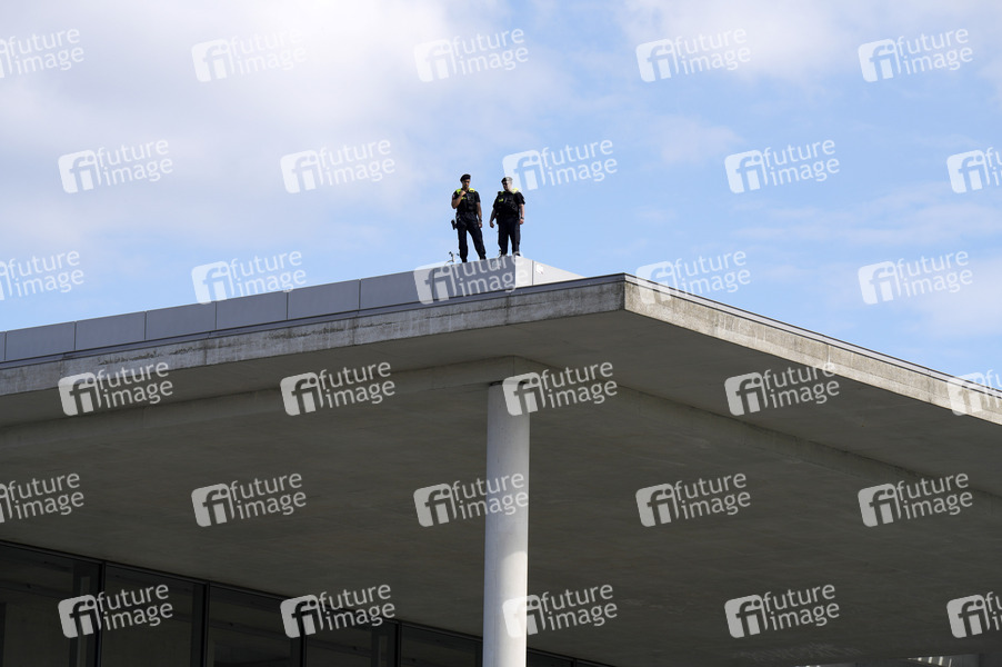 Polizei auf den Dächern rund um das Demokratiefest zu 75 Jahren Grundgesetz zwischen Kanzleramt und den Deutschen Bundestag. Berlin, 24.05.2024
