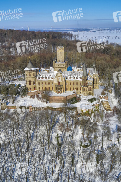 offizieller Wohnsitz der Prinzen von Hannover, Welfen, Bauzeit 1857-1867, Ernst August von Hannover, Neugotik, Architekt: Conrad Wilhelm Hase, Pattensen, Schnee, Winter, Winterlandschaft, Berg, Burg, Ausflugsziel, Sehenswürdigkeit, Luftaufnahme, Luftbild