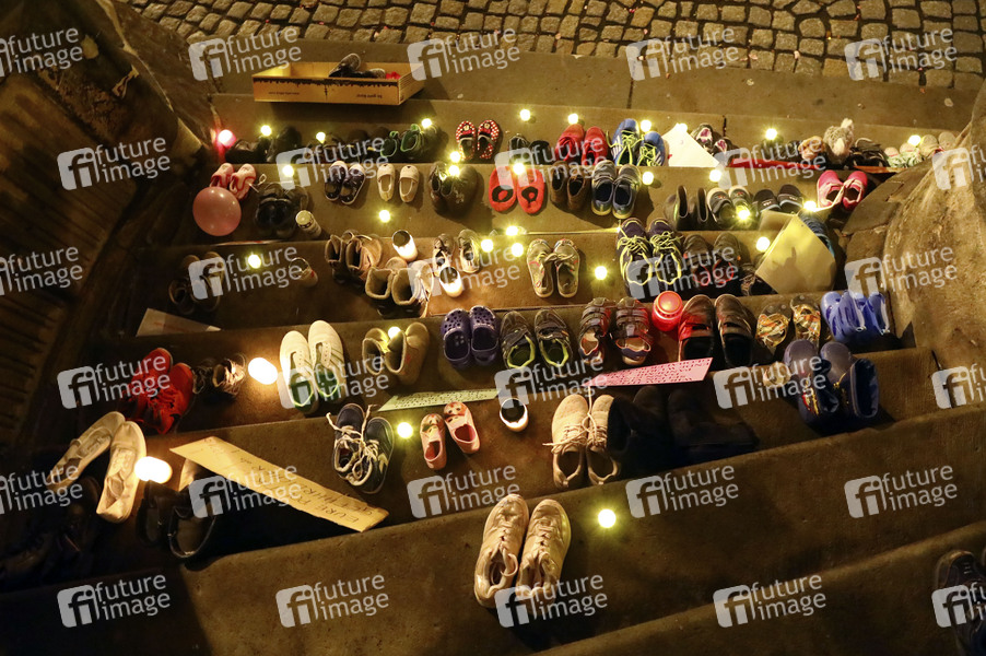 Aus Protest gegen erneute Schulschließungen haben Eltern Kinderschuhe, Plakate und Banner vor dem Rathaus Görlitz abgelegt. Görlitz, .22.03.2021